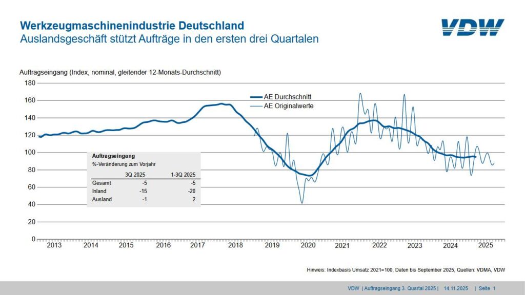 Im dritten Quartal 2025 sank der Auftragseingang in der deutschen Werkzeugmaschinenindustrie um 5%. Dabei gaben die Bestellungen aus dem Inland um 15% nach, die Bestellungen aus dem Ausland gingen leicht um 1% zurück. Von Januar bis September 2025 sank der Auftragseingang ebenfalls um 5%. Die Inlandsnachfrage fiel um 20%, die Auslandsbestellungen stabilisierten sich im Vergleich zum Vorjahr mit plus 2%.