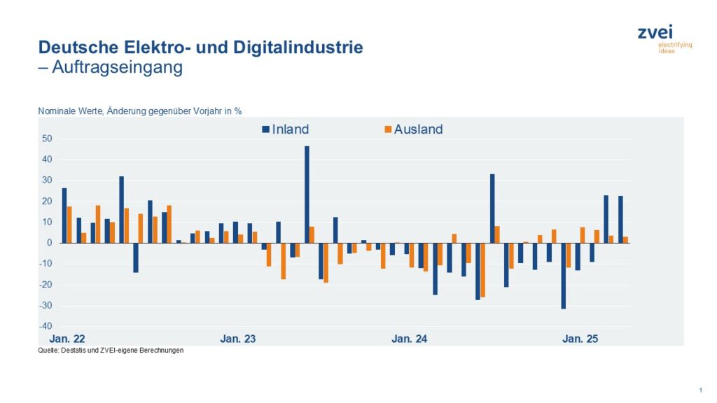 Auch im April zogen die Auftragseingänge in der deutschen Elektroindustrie an und lagen 11,6% über dem Vorjahresmonat. Wie schon im März war der Zuwachs bei den Inlandsbestellungen auch im April deutlich größer als bei denen aus dem Ausland. Erstere legten um 22,6% zu, letztere dagegen nur um 3%. Dabei gab es bei den Aufträgen aus dem Euroraum ein Plus von 9%, wohingegen die Bestellungen aus Drittländern so gut wie stagnierten (-0,2%). In den ersten vier Monaten gingen damit insgesamt 5,2% mehr neue Bestellungen ein als im gleichen Zeitraum 2024. Mit 17,9Mrd.€ lagen die Erlöse im April um 3,4% unter dem entsprechenden Vorjahreswert.