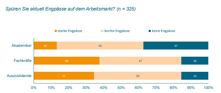 27% der Befragten gehen davon aus, dass sie zukünftig weniger Ausbildungsstellen anbieten werden und 23% geben an, ihr Angebot an Ausbildungsstellen ausbauen zu wollen. Zugleich spüren die Unternehmen nach wie vor Engpässe auf dem Ausbildungsmarkt. So berichten 35% von starken Engpässen und 50% von leichten Engpässen.