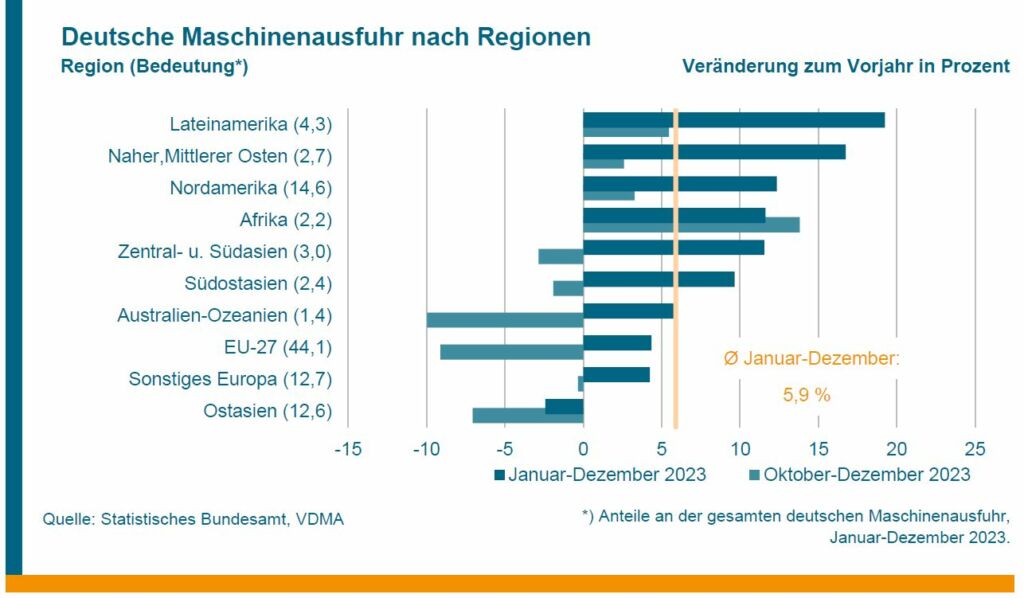 Die Nachfrage aus den USA, größter Einzelmarkt für die Maschinenexporteure aus Deutschland, schwächte sich zum Jahresende ebenfalls deutlich ab. Im vierten Quartal verzeichneten die Unternehmen aber noch ein Exportwachstum von nominal 3%. Im Gesamtjahr legten die Maschinenexporte in die USA sogar zweistellig um nominal 12,6% zu und kamen damit auf ein Exportvolumen von 28Mrd.€. Der Anteil der USA an den gesamten deutschen Maschinenexporten legte von 12,7% im Jahr 2022 auf 13,5% im Jahr 2023 zu.