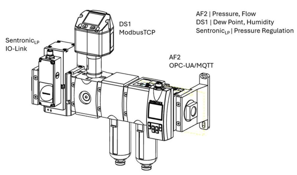 Zu den integrierten Sensoren gehören der Aventics AF2-Durchflusssensor und der Aventics DS1-Taupunktsensor. Der bewährte AF2-Durchflusssensor unterstützt Anlagen auf der ganzen Welt erfolgreich dabei, den Druckluftverbrauch zu senken und die Energieeffizienz zu steigern. Er überwacht kontinuierlich den Luftverbrauch in Pneumatikanlagen und ermöglicht ein schnelles Eingreifen bei Leckagen.