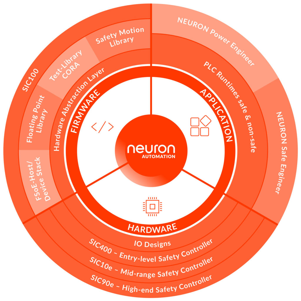 Mit dem hochskalierbaren und zertifizierten Safety-Baukasten stellt Neuron Automation seinen Kunden ein komplettes Portfolio zur Erstellung funktional sicherer Steuerungskomponenten bereit – von der Hardware über die Firmware bis zum Application Engineering. Kombiniert mit umfassenden Entwicklungsdienstleistungen ermöglicht es der Baukasten, Engineering-Projekte von der Idee bis zur Zertifizierung mit kurzer Time-to-Market und innerhalb des vereinbarten Budgets umzusetzen – und bietet somit langfristigen Investitionsschutz.