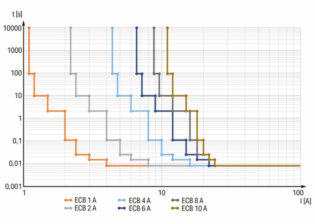 Elektronische Schutzschalter (engl. Electronic Circuit Breakers, kurz ECB) hingegen verwenden eine digitale Technologie zur Überwachung und Steuerung von Stromkreisen: Ein Mikrocontroller analysiert kontinuierlich die Stromflüsse und erkennt Abweichungen nahezu in Echtzeit. Halbleiterschalter wie Thyristoren schalten den Stromkreis bei Überlast oder Kurzschluss präzise und schnell ab. Dabei greifen sie auf gespeicherte Auslösekennlinien zurück. Diese definieren, wie ein Schutzschalter auf unterschiedliche Überstromsituationen reagiert, und legen fest, bei welchen Stromstärken und nach welchen Zeitintervallen der Schalter auslöst. Diese Präzision ist besonders wichtig bei geringen Überströmen und großen Leitungslängen. Hier versagen konventionelle Schalter oft. In industriellen Anwendungen, wo Maschinen oft über weite Strecken verteilt sind, spielt die Leitungsimpedanz eine entscheidende Rolle. Diese Größe bezeichnet den Widerstand, den ein Stromkreis aufgrund der Länge und Beschaffenheit der Leitungen aufweist. In weitläufigen Industrieanlagen führen lange Leitungswege zu einer deutlichen Erhöhung der Impedanz. Dank ihrer hohen Empfindlichkeit und der präzisen Überwachung durch Mikrocontroller arbeiten ECB weitgehend unabhängig von der Leitungsimpedanz und lösen bereits bei geringen Überströmen zuverlässig aus.