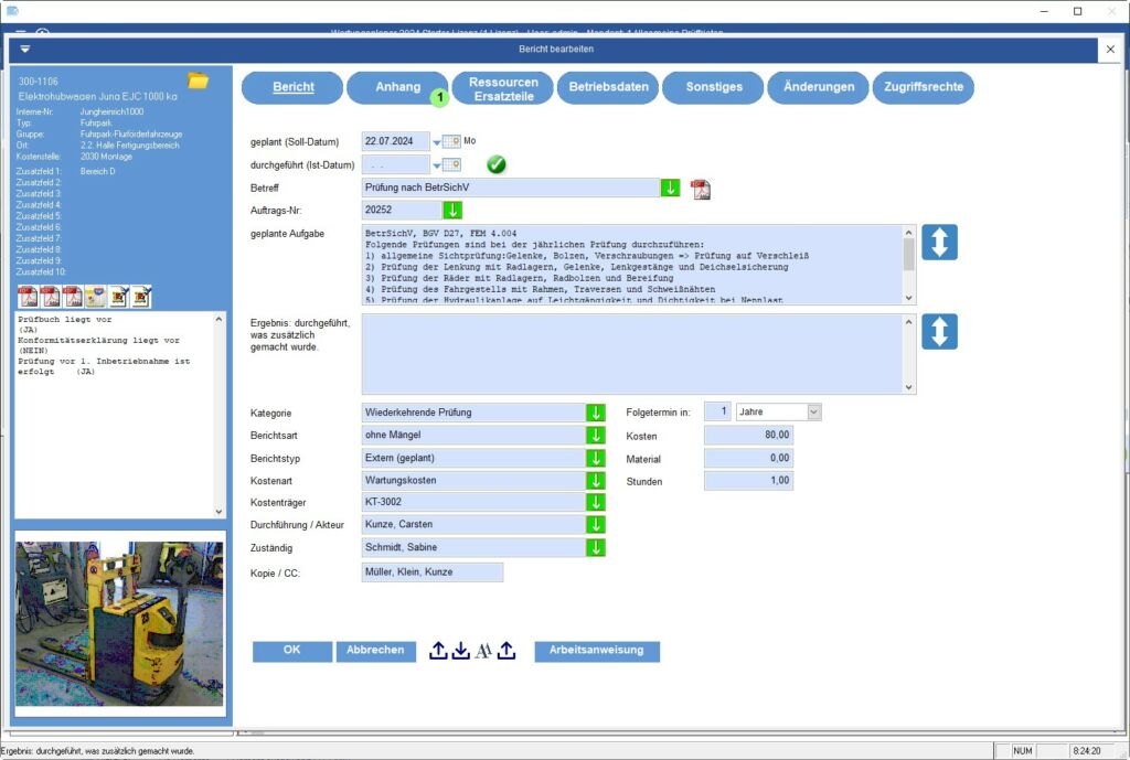 Automatische Erinnerungen per Mail sorgen dafür, dass keine Fristen verpasst werden, und über mobile Endgeräte kann eine direkte, medienbruchfreie Dokumentation mit Fotos und Videos erfolgen, was Zeit spart und einfach zu administrieren ist. Rechtskonforme Prüfprotokolle werden einfach bei der Maschine im System abgelegt. Sie fördern die Sicherheit, indem sie Audits vereinfachen. Durch die zentrale Speicherung von Daten werden Transparenz und Effizienz erhöht, was nicht nur Arbeitsprozesse optimiert, sondern auch die manuelle Organisation minimiert. Insgesamt trägt das digitale Prüffristenmanagement so zu mehr Nachhaltigkeit, Rechtssicherheit und einer ressourcenschonenden Arbeitsweise bei.