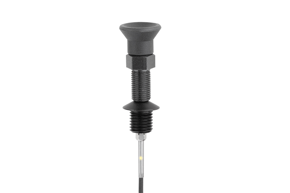 „Der integrierte induktive Sensor erfasst den Betätigungszustand des Bolzens“, beschreibt Florian Schweizer das Wirkprinzip. „Das Signal wird im Pilzgriff verarbeitet und an die Maschinensteuerung übertragen. Standardmäßig ist dafür ein 2m langes, dreiadriges Kabel vorgesehen. Der Sensor schaltet, sobald der Bolzen 1mm gezogen ist. Über die Maschinensteuerung lässt sich dann z.B. festlegen, dass der Bearbeitungszyklus erst dann beginnt, wenn der Bolzen eingerastet ist.“