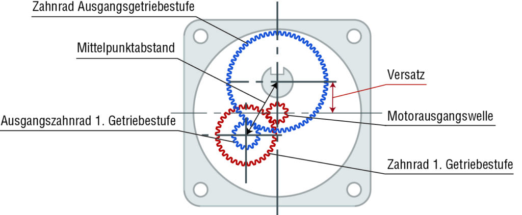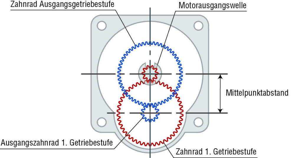 Zudem sind konventionelle Stirnradgetriebe so konstruiert, dass das Getriebegehäuse in die Projektionsebene der Motorrahmengröße passt. Versucht man dieses Design mit einer konzentrischen Wellenstruktur zu verbinden, ist der Mittelpunktabstand zwischen der Motorausgangswelle und dem Zahnradpaar der ersten Stufe begrenzt. Das hat zur Folge, dass der Mittelpunktabstand aller Zahnradpaare kurz ist und das Zahnrad der Ausgangsstufe nur einen kleinen Durchmesser aufweist. Dadurch ist es schwierig, Stirnradgetriebe mit einem Untersetzungsverhältnis >10 zu konstruieren bzw. mit ihnen hohe Drehmomente zu übertragen.