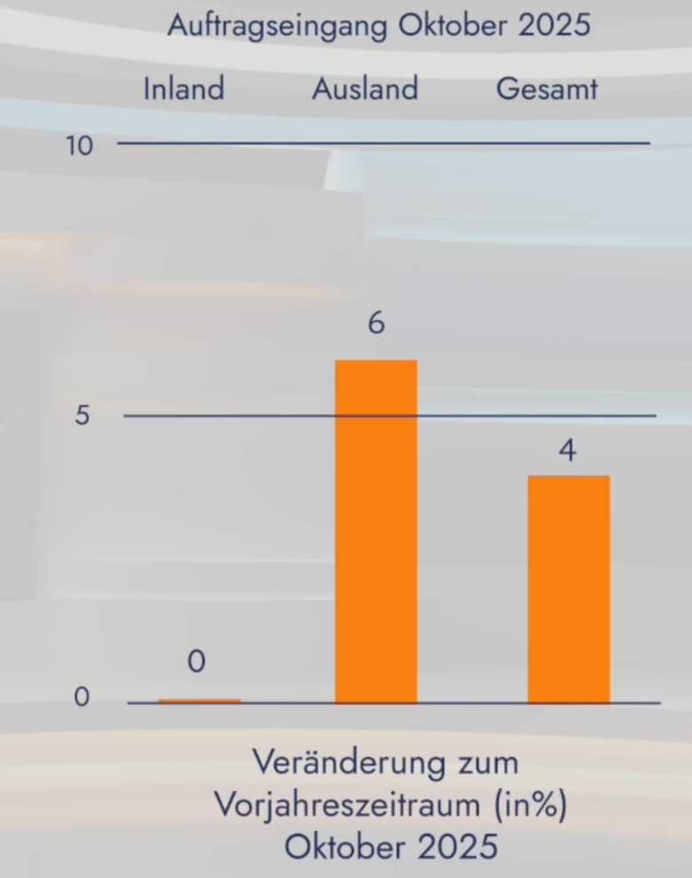 Im weniger schwankungsanfälligen Dreimonats-Zeitraum von August bis Oktober 2025 verbuchten die Unternehmen insgesamt ein Auftragsminus von real 6%. Dabei sanken die Inlandsbestellungen um 3%, das Ausland verbuchte einen Rückgang von 8%. Aus den Euroländern kamen 2% weniger Bestellungen, die Nicht-Euroländer verbuchten ein Minus von 10%.
