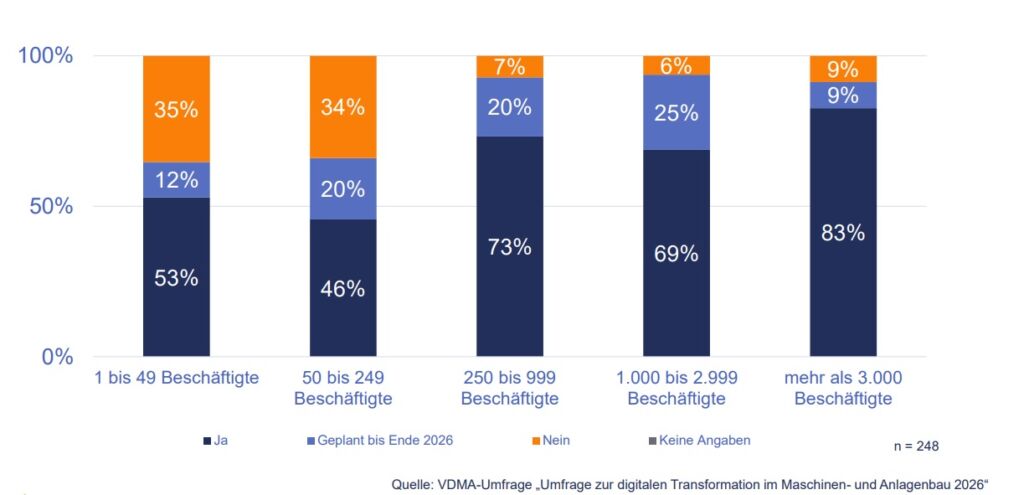 Sechs von zehn Unternehmen verfügen demnach bereits über eine Digitalisierungsstrategie, weitere 19% planen eine solche bis Ende 2026. Gleichzeitig zeigt die Umfrage aber auch, dass 22% der Unternehmen bislang ohne klare strategische Leitplanke in ihrer Digitalisierung agieren. „Die strategische Verankerung digitaler Transformation ist abhängig von der Unternehmensgröße“, erklärt Guido Reimann, stellv. Geschäftsführer des VDMA Software und Digitalisierung und Leiter des Kompetenznetzwerks Künstliche Intelligenz. „Während bei Großunternehmen ab 3.000 Beschäftigten 83% eine Digitalisierungsstrategie haben, sind es bei kleinen Unternehmen mit bis zu 49 Beschäftigten 53%. Bei Unternehmen mit 250 bis 999 Mitarbeitenden verfügen bereits 73% über eine Digitalisierungsstrategie.“