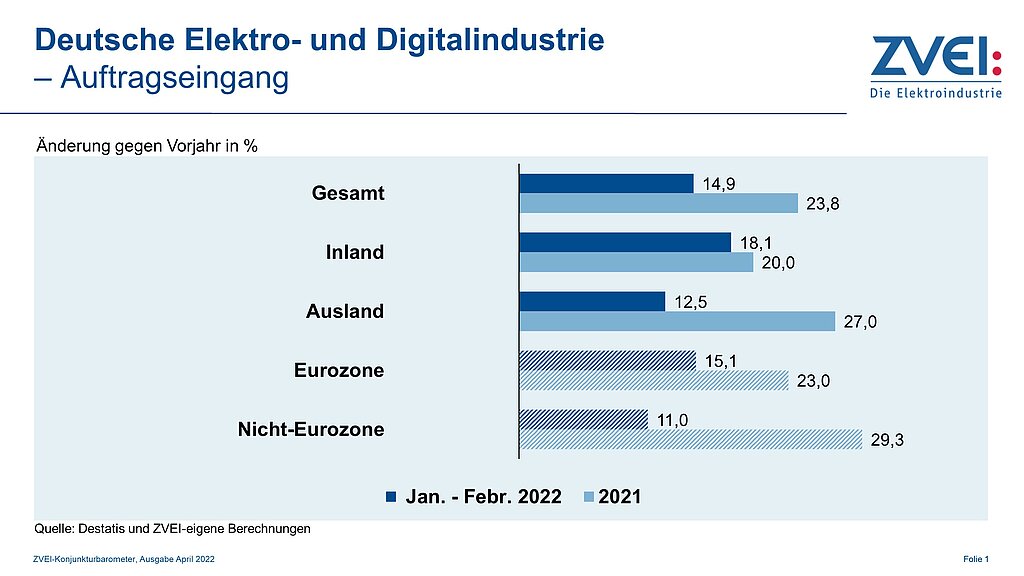 Die Auftragseingänge in der deutschen Elektro- und Digitalindustrie haben ihren Vorjahreswert im Februar 2022 um insgesamt 8,6% übertroffen. Dabei stiegen die Bestellungen aus dem Inland (+12%) doppelt so stark wie die aus dem Ausland (+6%). Aus der Eurozone gingen im Februar 11,5% mehr Aufträge ein als im Vorjahr. Bei den Bestellungen aus Drittländern fiel das Plus mit 2,9% moderater aus. In den zusammengenommenen ersten beiden Monaten des Jahres nahmen die Auftragseingänge um 14,9% gegenüber Vorjahr zu. Die Inlandsbestellungen zogen um 18,1% und die Auslandsorder um 12,5% an. Aus dem Euroraum gingen zwischen Januar und Februar 15,1% mehr neue Aufträge ein als im gleichen Vorjahreszeitraum. Kunden aus Drittländern erhöhten ihre Bestellungen hier um 11%. „Erste etwaige Auswirkungen des Ukraine-Kriegs werden sich zeigen, sobald die Daten für den März vorliegen,“ sagte ZVEI-Chefvolkswirt Dr. Andreas Gontermann. Die preisbereinigte Produktion ist im Februar um 2,5% gegenüber Vorjahr gestiegen. Kumuliert von Januar bis Februar lief damit ein Plus von 4% – wiederum im Vergleich zum selben Vorjahreszeitraum – auf. Der Branchenumsatz belief sich im Februar 2022 auf 17,1Mrd.€. Damit lag er um 11,7% höher als vor einem Jahr.