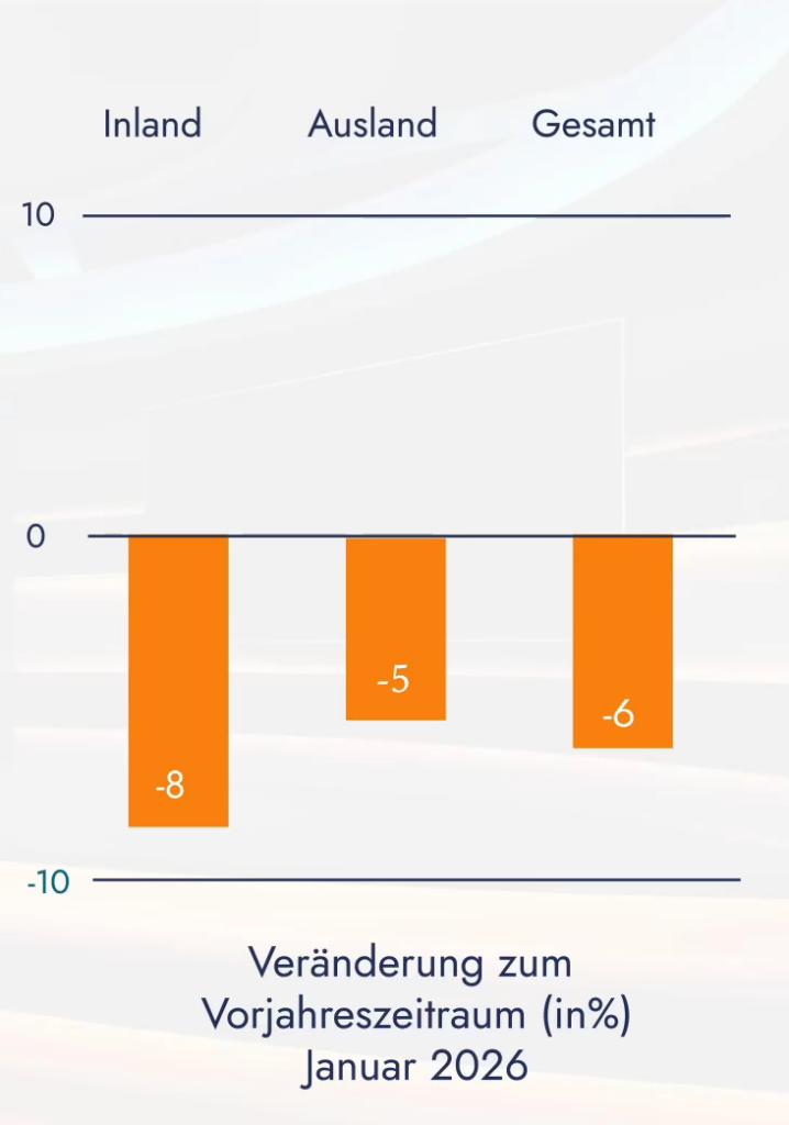 Die Maschinenbauunternehmen in Deutschland haben einen schwachen Jahresstart in ihren Auftragsbüchern verbucht. Im Januar blieben die Bestellungen preisbereinigt um 6% unter dem Vorjahreswert. Aufträge aus dem Inland fielen um 8% niedriger aus als im Januar 2025, aus dem Ausland kamen 5% weniger Bestellungen. Dabei zeigte sich die Nachfrage aus den Euro-Partnerländern (-8%) noch schwächer als das Geschäft mit den Nicht-Euroländern (-4%). „Einige Stimmungsindikatoren hatten zuletzt nach oben gezeigt, daher ist der Auftragsrückgang im Januar ein überraschend schwacher Start ins Jahr“, sagt VDMA-Chefvolkswirt Dr. Johannes Gernandt. Im weniger schwankungsanfälligen Dreimonats-Zeitraum von November 2025 bis Januar 2026 verbuchten die Unternehmen insgesamt ein Auftragsminus von real 2% Dabei sanken die Inlandsbestellungen um 4%, das Ausland verbuchte einen Rückgang von 1%. Aus den Euroländern kamen 4% weniger Bestellungen, die Aufträge aus den Nicht-Euroländern stagnierten.