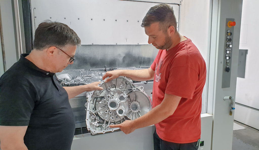 Die Produktion bei Schlote in Harzgerode besteht aus insgesamt zehn Fertigungszellen. In jeder dieser Zellen stehen drei Maschinen des Herstellers SW, zwei Doppelspindler W06 und ein Einspindler One6. Das Bauteil wird in drei Spannungen bearbeitet, wobei die Doppelspindler die beiden ersten Spannungen übernehmen und in der dritten das Finishing stattfindet.