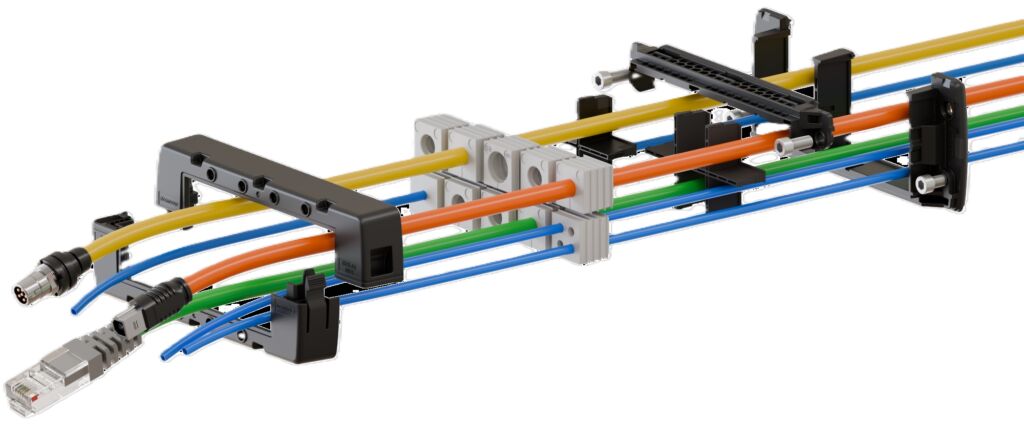 Die in Schwarz gehaltene Kabeleinführung passt auf Standardausbrüche für 4-,10-, 16- und 24-polige schwere Steckverbinder. Des Weiteren verfügt der 8er-Rahmen über einen Steg und kann mit zwei 4er-Inlays bestückt werden. KDSI-SR-G eignet sich für Leitungen aller Steckergrößen. Der Rahmen lässt sich entweder direkt am Gehäuse mit Schrauben befestigen, teilmontieren oder für eine spätere Montage am Gehäuse extern vorkonfektionieren.