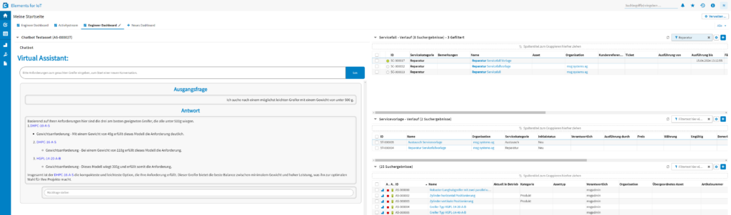 Ein Demonstrator von Festo, Contact Software und MSG zeigt, wie sich die AAS bereits in der Angebotserstellung einsetzen lässt. Ziel ist es, durch die Kombination der AAS mit einem Datenökosystem die Markteinführungszeit zu verkürzen. Dabei stellt Festo seinen Produktkatalog über einen AAS-Server bereit, sodass Maschinenbauer die benötigten Greifer-Komponenten maschinenlesbar über einen digitalen Produktkatalog finden können. Der Zugriff auf den Komponentenkatalog erfolgt über ein PLM-basiertes Datenökosystem von Contact Software. Die Contact Elements Plattform kann den von der IDTA entwickelten AAS-Datenstandard importieren, wodurch Maschinenbauer die Produktkataloge ihrer Komponentenlieferanten in ihrer gewohnten Arbeitsumgebung durchsuchen können. Ein von MSG entwickelter virtueller Assistent unterstützt die Auswahl der optimalen Komponenten für Angebote. Basierend auf einer RAG-Architektur (Retrieval-Augmented-Generation) kann das System bei Anfragen relevante Informationen aus einer Wissensdatenbank (in diesem Fall den importierten AAS-Files) einbeziehen. Dabei besteht die Möglichkeit neben technischen Merkmalen auch Informationen zum Product Carbon Footprint abzurufen. Zusätzlich bietet der Chatbot den Link zur AAS als Quelle an, sodass der Maschinenbauer den Vorschlag validieren und bestätigen kann.