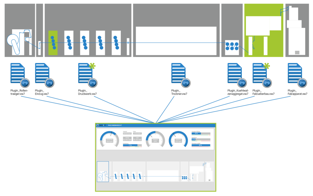 Ein Beispiel für ein in größeren Teilen modularisiertes Projekt ist das HMI einer Druckmaschine (siehe Bild). Jedes ihrer Teile kann als Modul abgebildet werden. Für die Druckwerke lassen sich die Module noch für jede Druckfarbe als Instanz des Moduls anlegen. Alle Module sollten sinnvoll zusammengefasst in Bibliotheken zur Verfügung stehen. Die Verwaltung der Bibliotheken sollte möglichst einem geeigneten Tool übertragen werden, das Versionierung unterstützt und parallele Entwicklungszweige erlaubt. All dies zusammengefasst ergibt einen HMI-Baukasten, aus dem in einer Mischung von standardisierten und individuellen Bausteinen zügig und in hoher Qualität Applikationen entstehen.